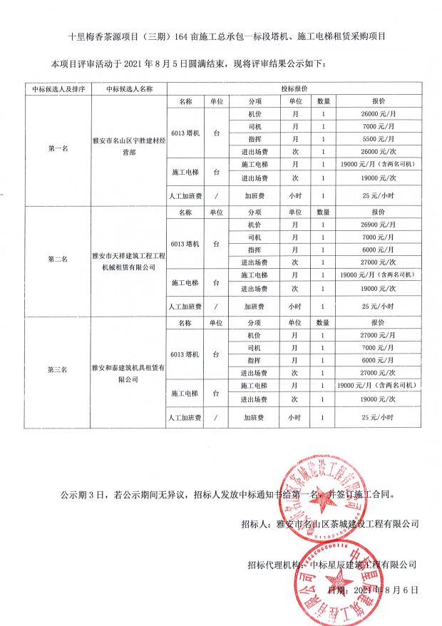 十里梅香茶源項目(三期)164畝施工總承包一標(biāo)段塔機(jī)、施工電梯租賃采購中標(biāo)公示